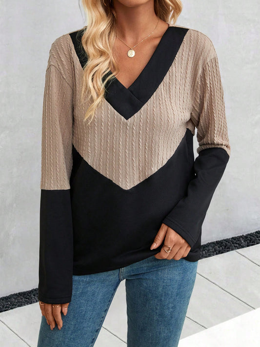 Pattern type: Contrast Style: Chic Features: Basic style Neckline: V-neck Length: Regular Sleeve length: Long...