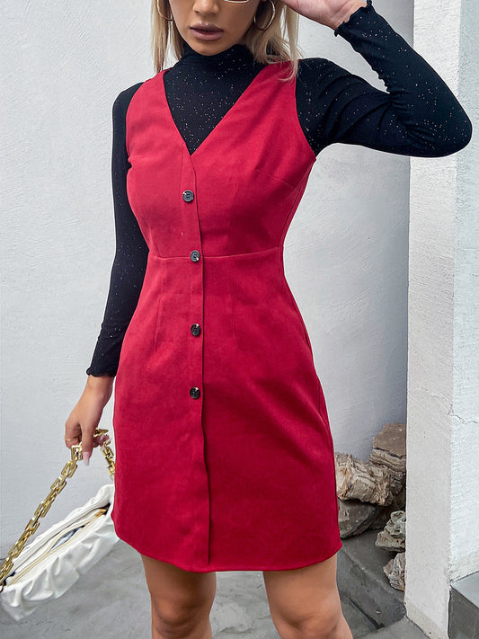 Pattern type: Solid Style: Chic Features: Buttoned Neckline: V-neck Length: Mini Sleeve length: Sleeveless Sleeve...