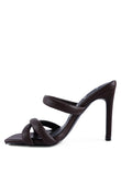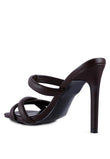 These high-heeled slip-ons are comfortable with soft cushion innersole. The criss-cross puffed straps on the front are an elevating element. The sandals are trendy and versatile, ideal for almost any occasion and outfit.