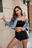 Collared Neck Long Sleeve Cropped Denim Jacket