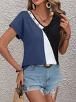 Color Block Decorative Button V-Neck Tee
