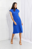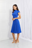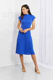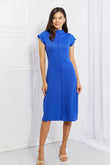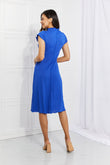 The perfect dress for anything from a business professional look to a dinner date, this sophisticated piece features a mock neck, front center seam, and lettuce trim. It falls just below the knee for a smart vibe. Pair with pumps and a clutch to finish the look.