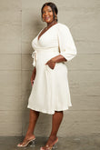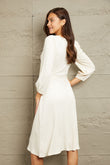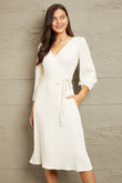 This versatile midi dress features a timeless wrap-style design that flatters every figure, while the waist tie enhances your silhouette for a confident and chic look. The ruching sleeve detail adds a touch of elegance to the long sleeves, making this dress perfect for both daytime and evening occasions.
