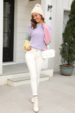 Double Take Color Block Round Neck Drop Shoulder Sweater