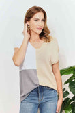 This color block knit top features a V-neckline, adding a touch of sophistication. The short sleeves offer a comfortable and casual look. The color block design adds a modern and stylish element to the top, making it a versatile and fashionable choice for any occasion.