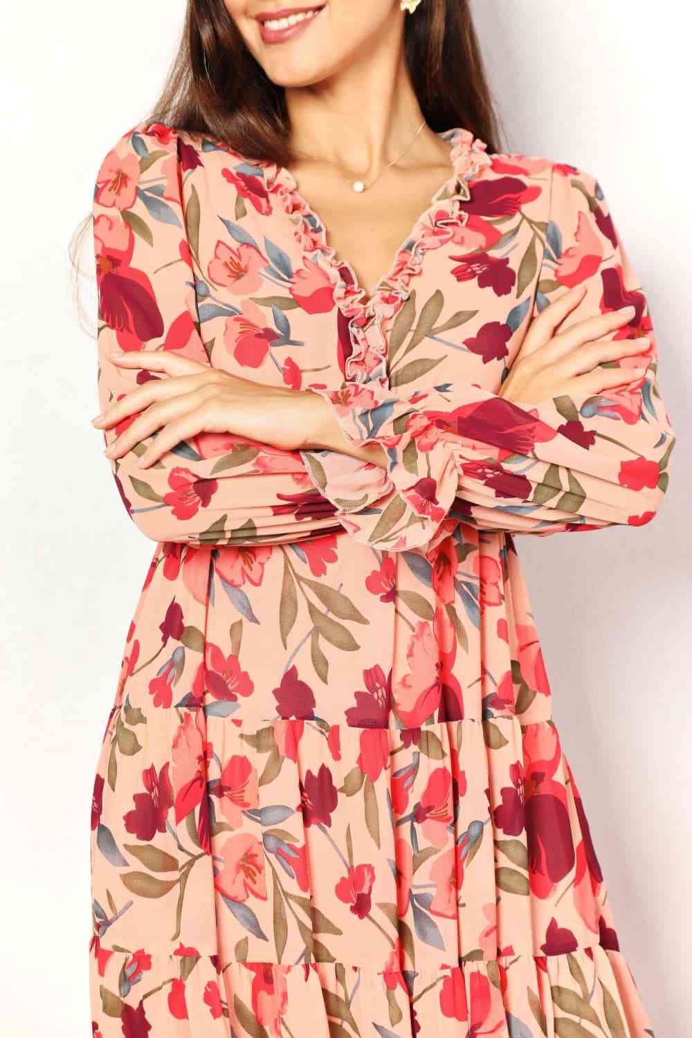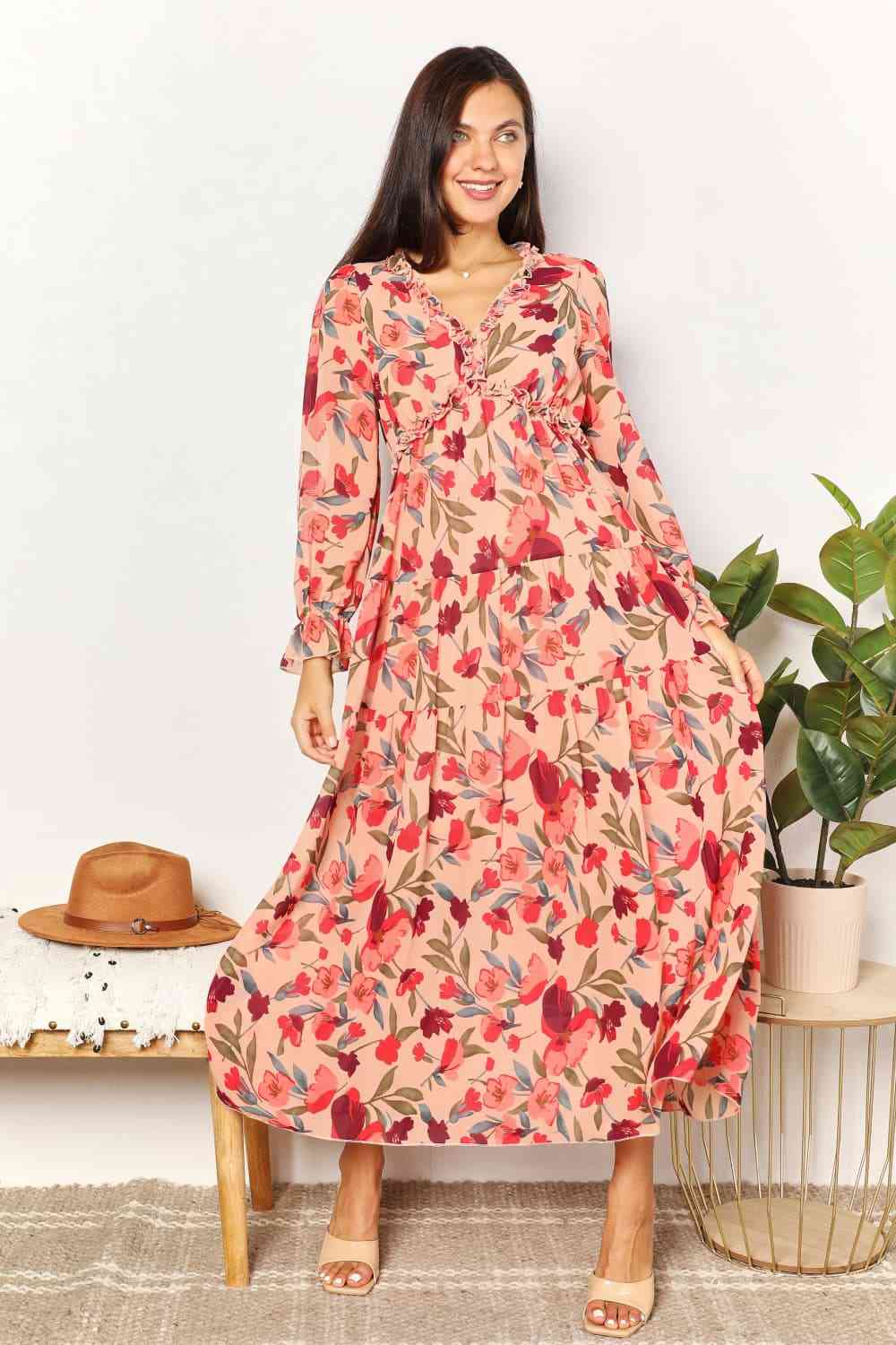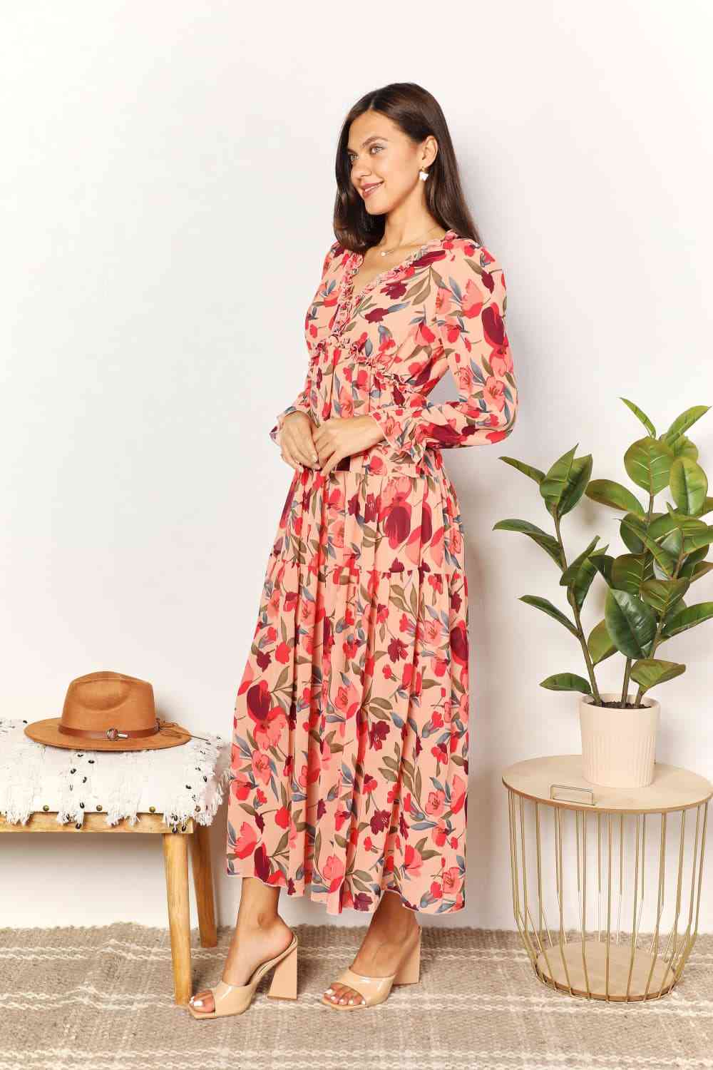 Double Take Floral Frill Trim Flounce Sleeve Plunge Maxi Dress