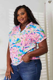 Make a statement with this Floral Notched Neck Short Sleeve Top. The beautiful floral print and unique notched neckline create a stylish and feminine look, perfect for adding a touch of elegance to your outfit.