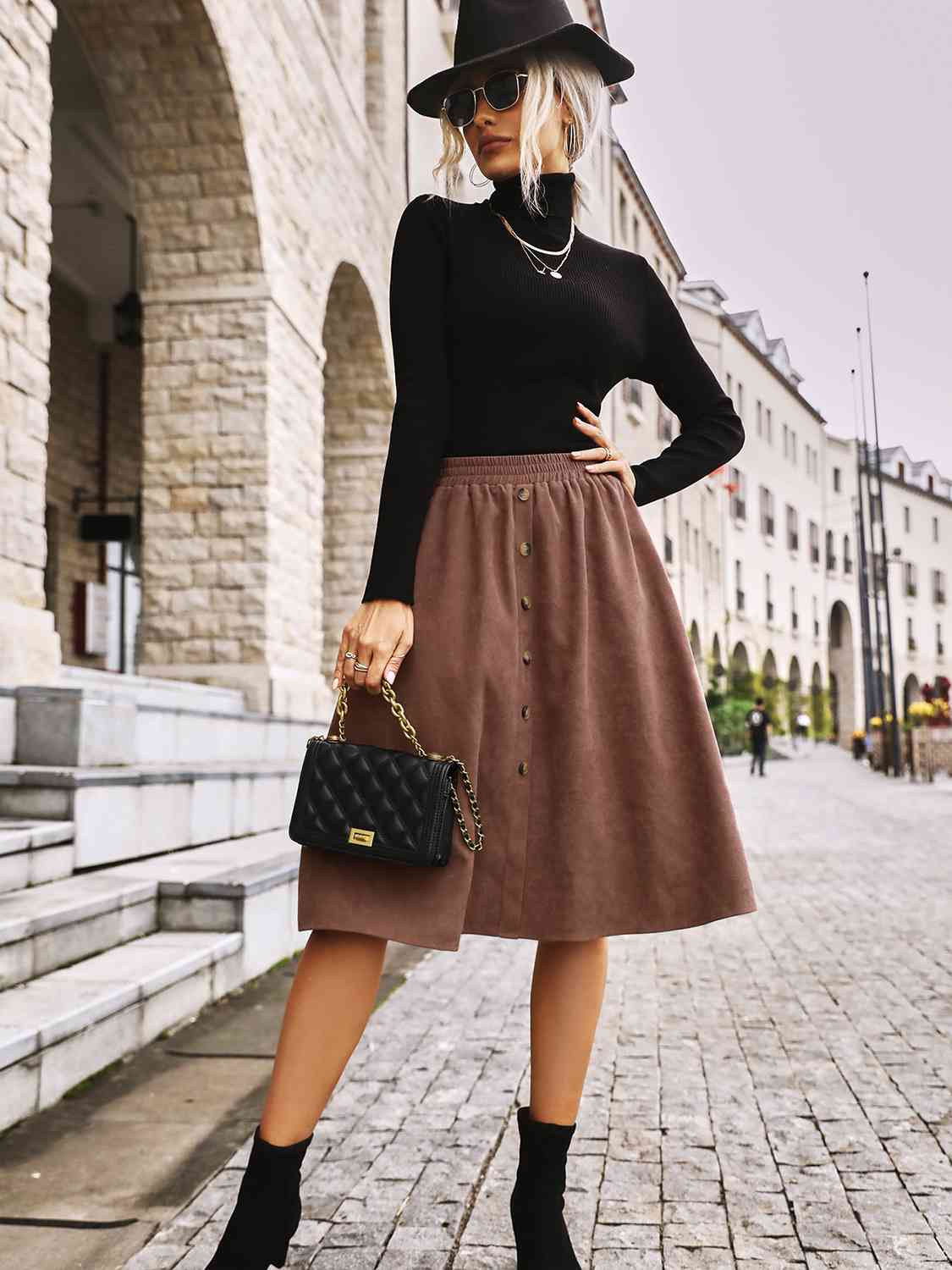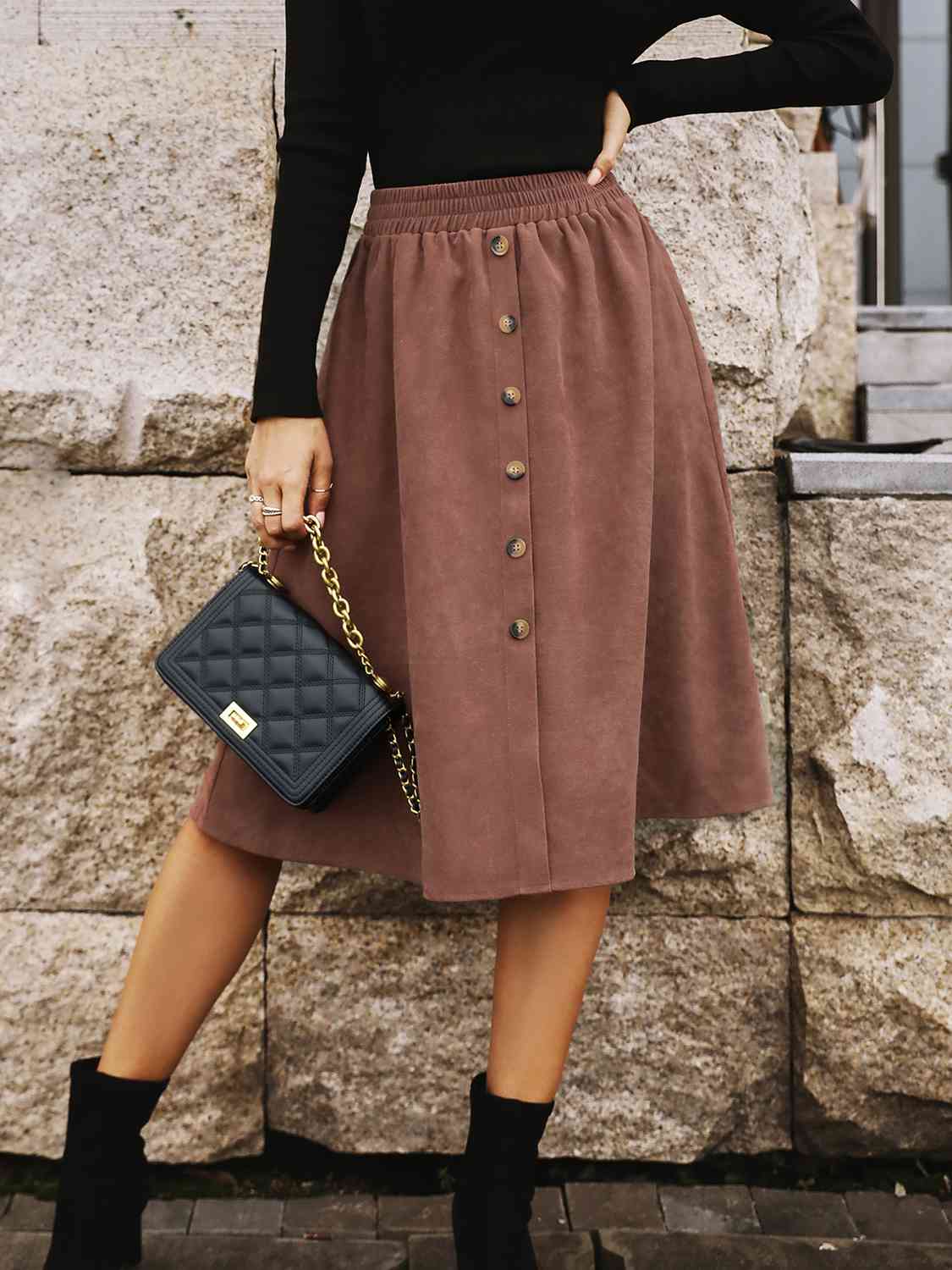 This Elastic Waist Buttoned Skirt from Shop Doll Fits is a stylish addition to any wardrobe. Crafted from a blend of 85% polyester and 15% spandex, this skirt is sheer and opaque, and not lined. It features a buttoned front and an elastic waistband for a comfortable fit. Care instructions are simple: machine wash cold and tumble dry low.