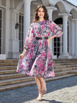 Floral Print Round Neck Balloon Sleeve Midi Dress