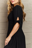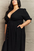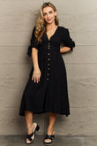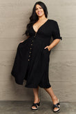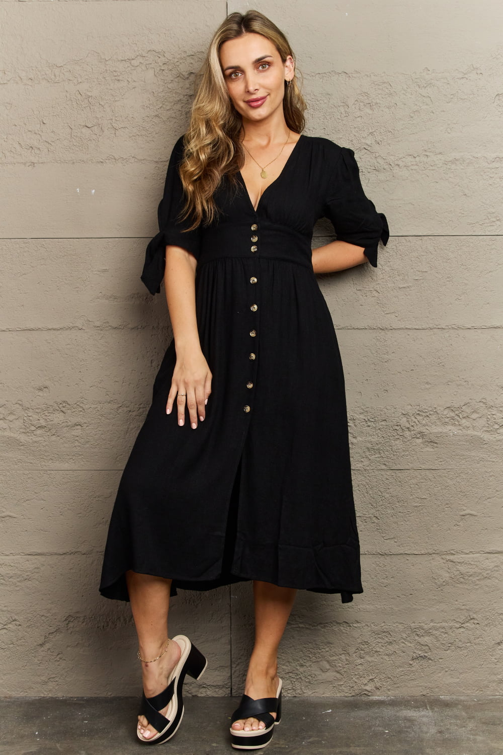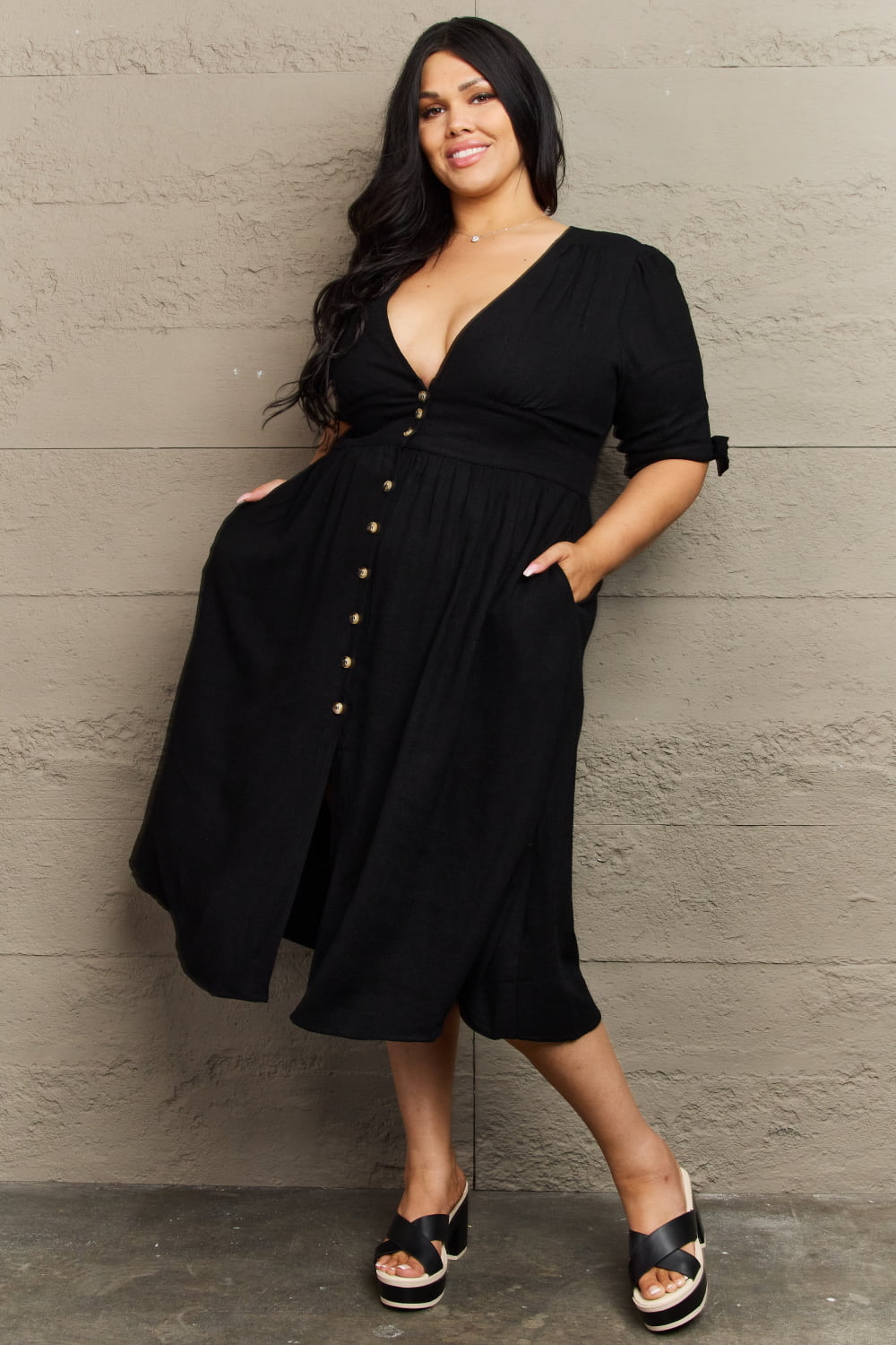 Designed to elevate your style with a perfect blend of sophistication and comfort. Crafted from high-quality linen, the dress showcases a delightful texture that adds a touch of uniqueness to your ensemble. The V-neckline and puff sleeves add a feminine charm, while the button-down front allows for effortless wear and a customizable fit. With full lining ensuring a smooth silhouette and convenient pockets for added functionality, this midi dress is a must-have addition to your wardrobe, ideal for both casual outings and special occasions. Step out in confidence and grace with this versatile and elegant piece.