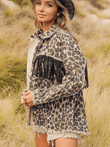 Leopard Fringe Detail Collared Neck Denim Jacket