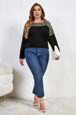 Melo Apparel Plus Size Leopard Trim Round Neck Long Sleeve Tee
