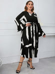 Melo Apparel Plus Size Printed Tie Belt Flare Sleeve Round Neck Midi Dress