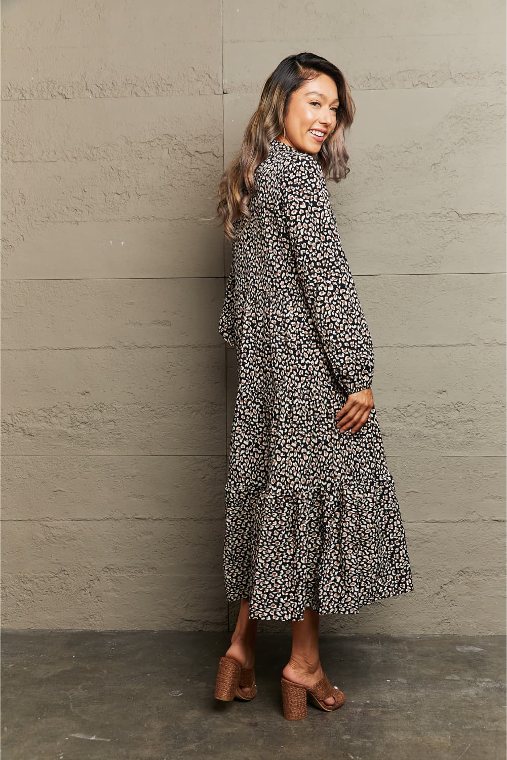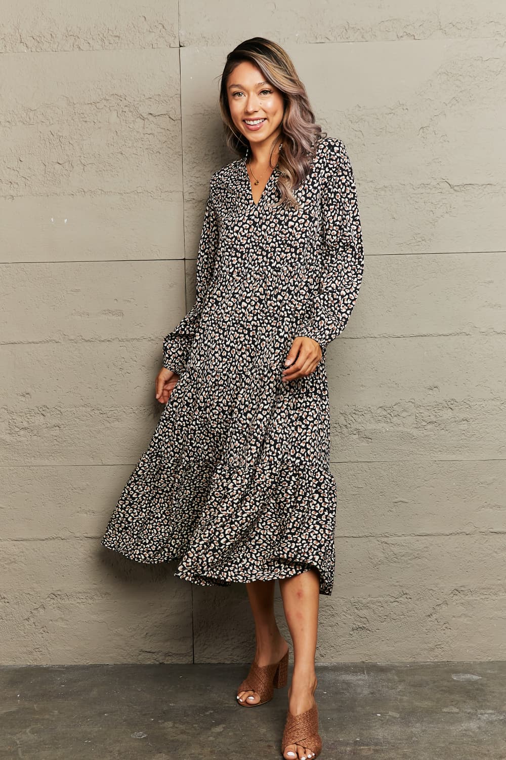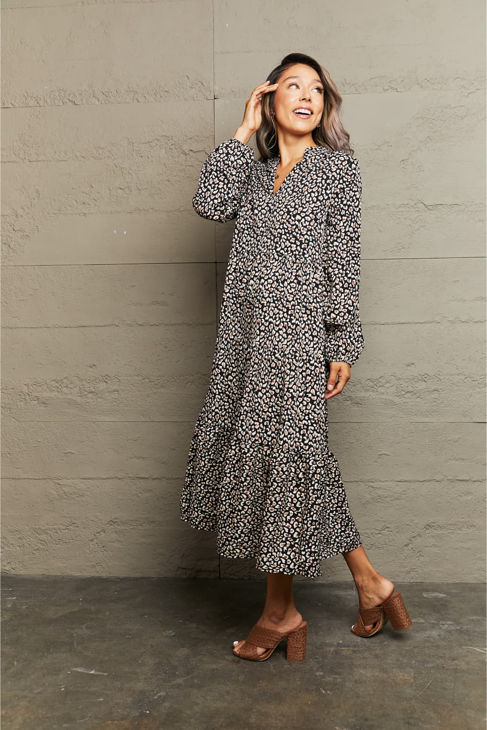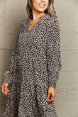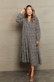 Notched Neck Long Sleeve Midi Dress