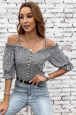 Plaid Buttoned Sweetheart Neck Cold-Shoulder Top