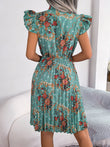 Pleated Floral Printed Tie Neck Knee Length Dress