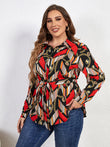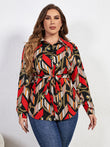 Plus Size Printed Collared Neck Tie Waist Long Sleeve Shirt