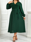 Plus Size Surplice Neck Tie Waist Long Sleeve Midi Dress
