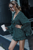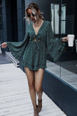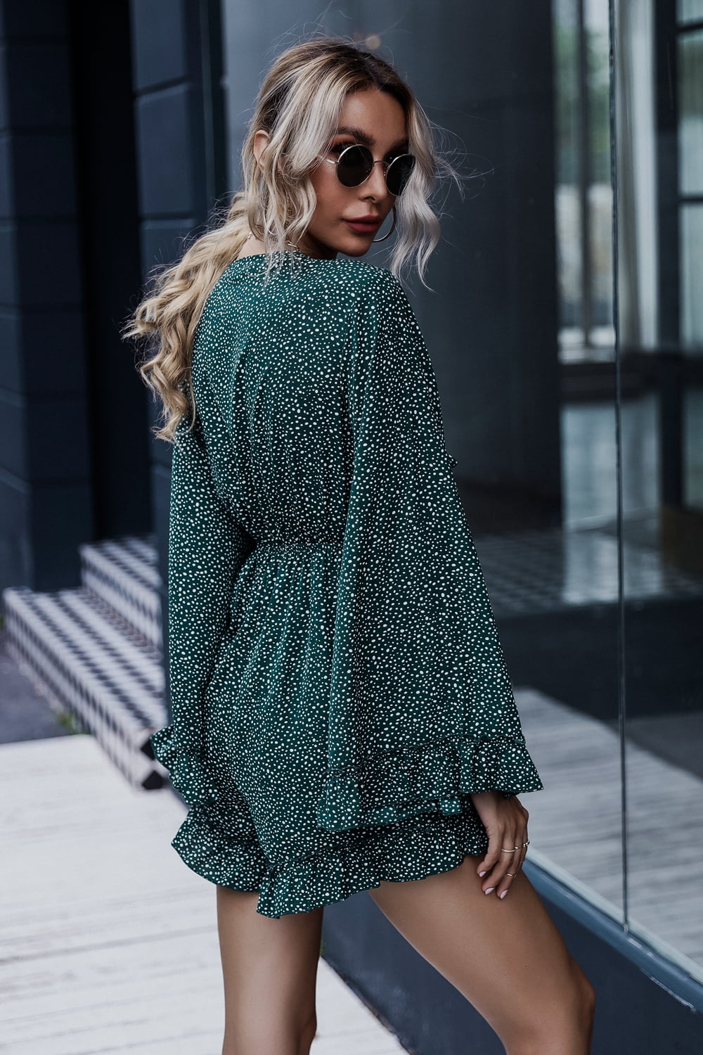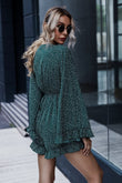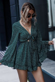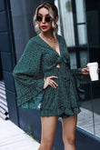 Printed Flare Sleeve Plunge Neck Ruffle Trim Mini Dress