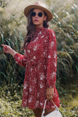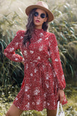 Printed Mock Neck Long Sleeve Tie Waist Mini Dress