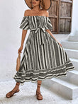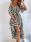Printed Off-Shoulder Tie Belt Midi Dress