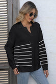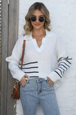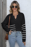 Ribbed Notched Neck Striped Long Sleeve Sweater