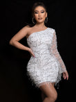 Sequin One Shoulder Spliced Mesh Sleeve Dress