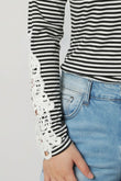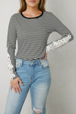 Striped Round Neck Long Sleeve Lace Trim T-Shirt