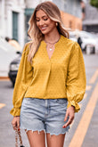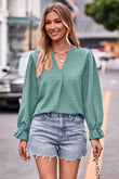 Swiss Dot Notched Neck Flounce Sleeve Blouse