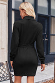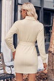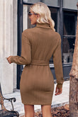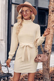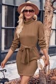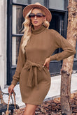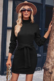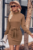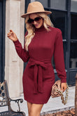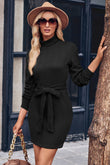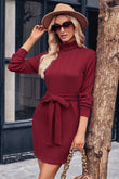 Turtle Neck Long Sleeve Tie Belt Mini Dress