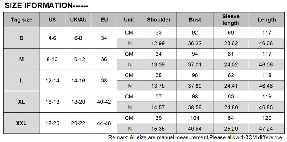 S: shoulder 12.9 in, bust 35.9 in, sleeve length 23.4 in, length 45.6 in