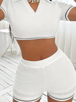 Waffle-Knit Collared Neck Cropped Top and Shorts Set